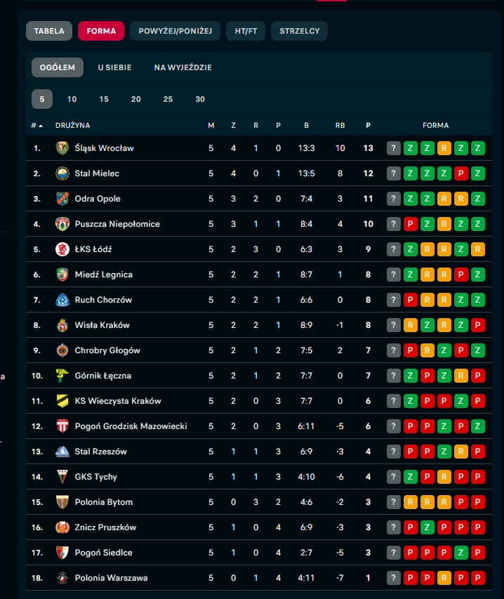 Jeżeli weźmiemy pod uwagę 5. ostatnich spotkań to w ligowej tabeli zajmujemy, zaszczytne, ostatnie miejsce. W tym okresie wraz z Pogonią straciliśmy również najwięcej bramek.