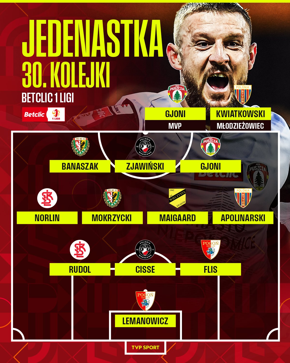 Triumf nad Chrobrym Głogów (1:0) spowodował, że do oficjalnej jedenastki 30. kolejki Betclic I ligi trafił Souleymane Cissé i Łukasz Zjawiński, który był autorem zwycięskiej bramki w sobotnim spotkaniu.
